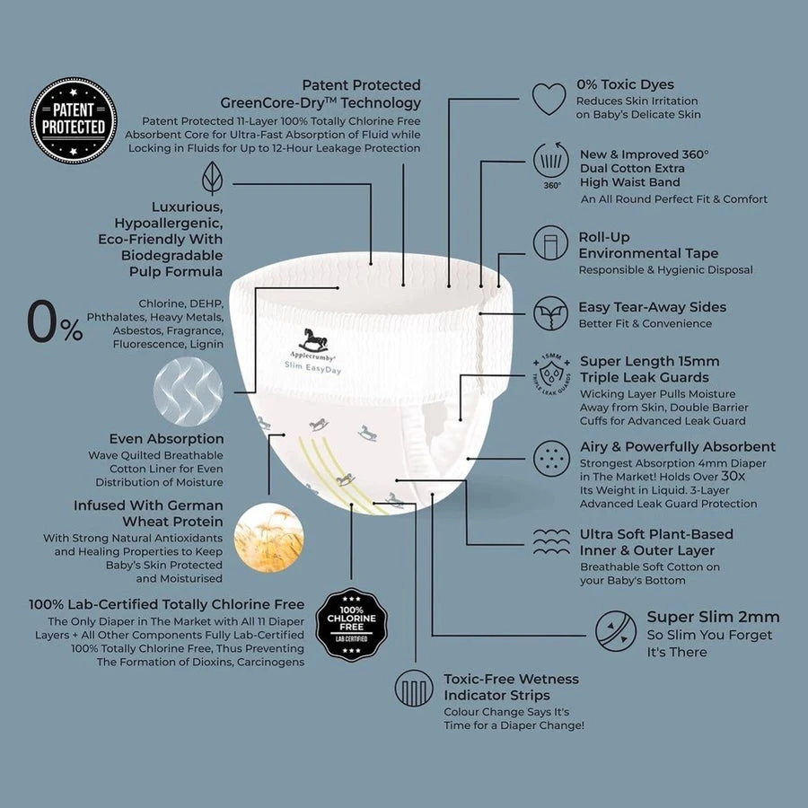 Applecrumby® diapers are Patent Protected 100% CHLORINE FREE, making it friendly to your baby’s bottom and the environment!