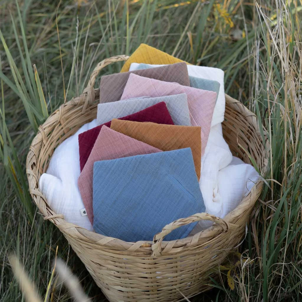 The BIBS Bandana bib is made of 100% GOTS certified organic muslin cotton. The dribble bib consists of multiple layers to ensure maximum absorbency and can be used to catch drool and regurgitation after feeding.