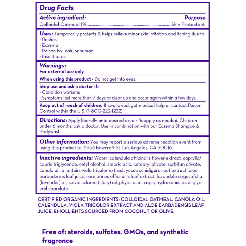 A life-saver for eczema sufferers of all ages, this powerful moisturizer relieves eczema flare ups with the help of organic, gluten-free colloidal oatmeal. Enriched with organic calendula extract and aloe vera to further soothe and hydrate irritated skin. Plant-based emollients help lock in moisture, which keeps your skin feeling hydrated for longer and prevents future outbreaks. The light, calming scent from French lavender and clary sage essential oils can help ease frazzled feelings.