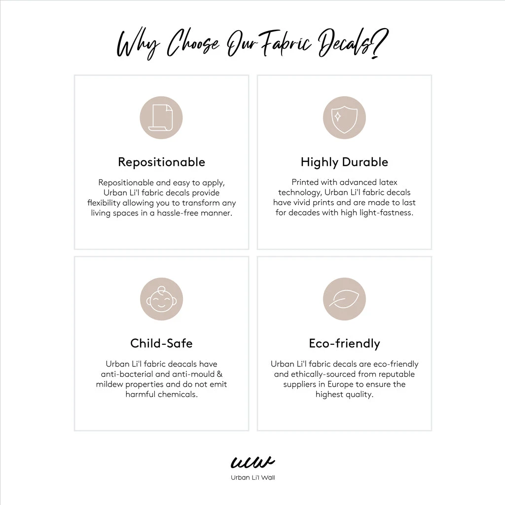 Urban Li’l fabric wall decals are repositionable without damage to surface, non-toxic and eco-friendly.