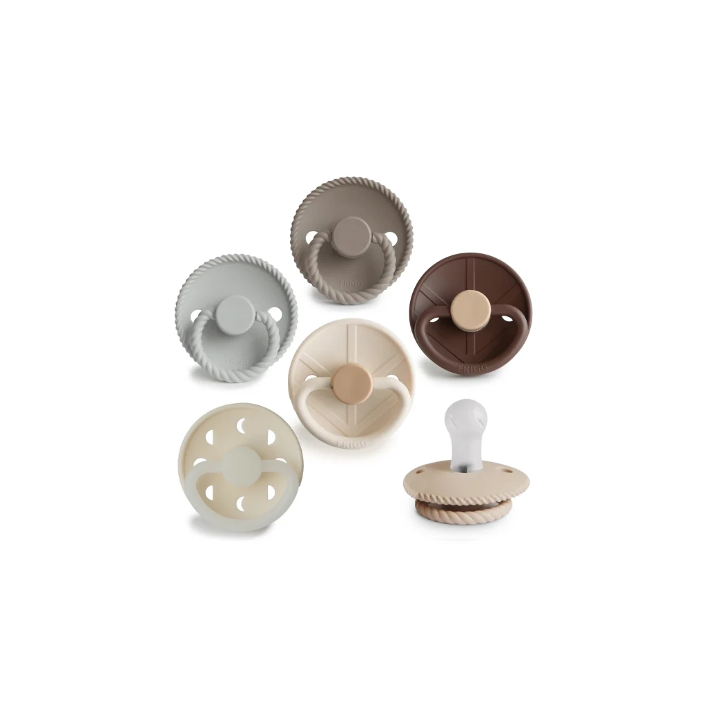 - FRIGG 6-Pack ‘Earthy Wonder’, consists of 6 round pacifiers in shades of a warm embrace of the earth itself. These pacifier colors embody the harmony of the natural world.
