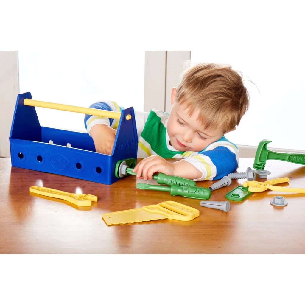 No job is too big for the world’s most environmentally friendly tool kit! This awesome 15 piece set includes a tool box, phillips screwdriver, flat screwdriver, hammer, saw, wrench, pliers, 2 two-hole connectors, 2 nails, 2 bolts, and 2 nuts. The Green Toys™ Tool Kit turns work into Good Green Fun™!