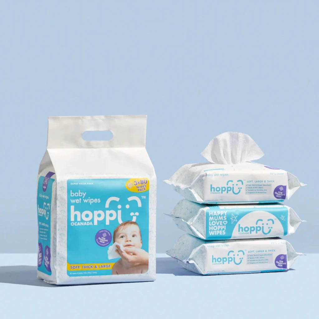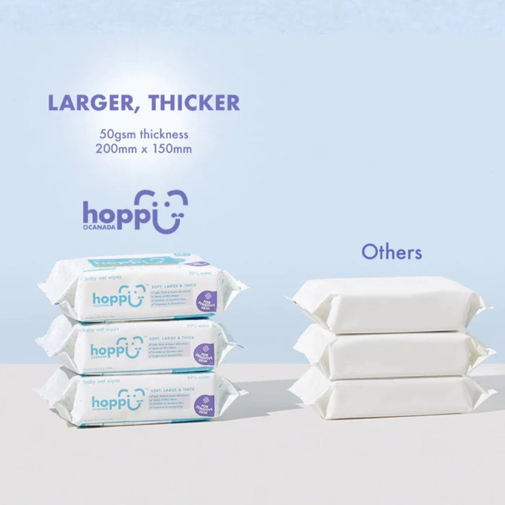 Hoppi™ Baby Wet Wipes is a 99% water wet wipes specially designed for the newborn & sensitive skin babies. It is softer, thicker, larger, and more durable than the average baby wet wipes in the market, while adhering to the highest international standards.