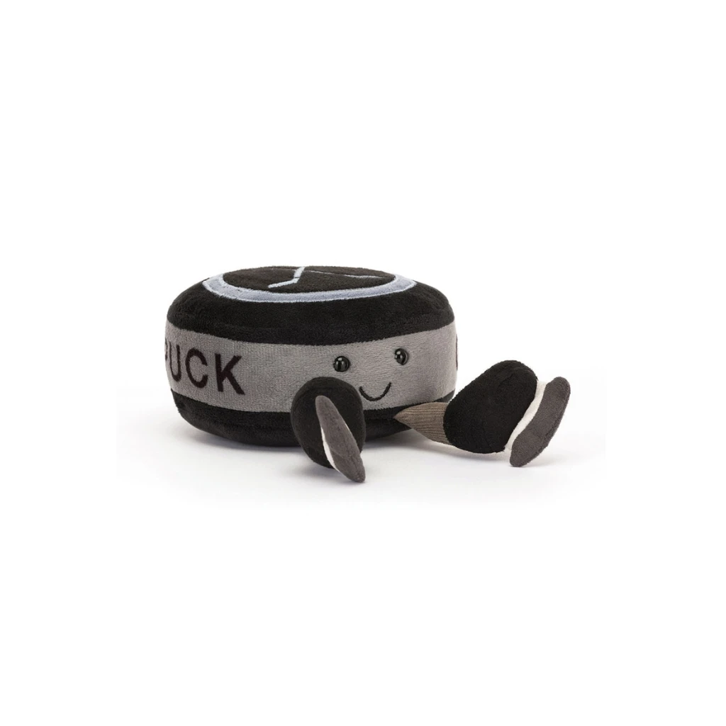 Amuseables Sports Hockey Puck is stunningly textured, with soft black fur, a grey tummy band and denim-blue suedette patches, topped with embroidered hockey sticks. With mocha cord legs and funky skates in black, cream and grey faux-suede, this puck’s absolutely a winner.