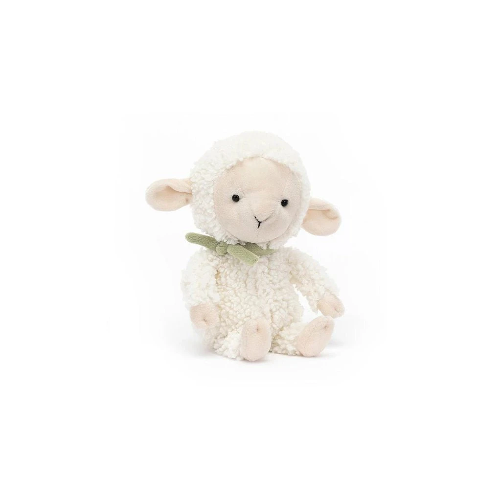 Fuzzkin Lamb is a diddy darling in shades of peaches and cream. This loving lamb is tickly-textured, with a scruffle fleece, pink waggle ears, soft stitch hooves and a knotty green scarf. A travelling tiny for any journey, this Fuzzkin loves riding in the car, pram or buggy!