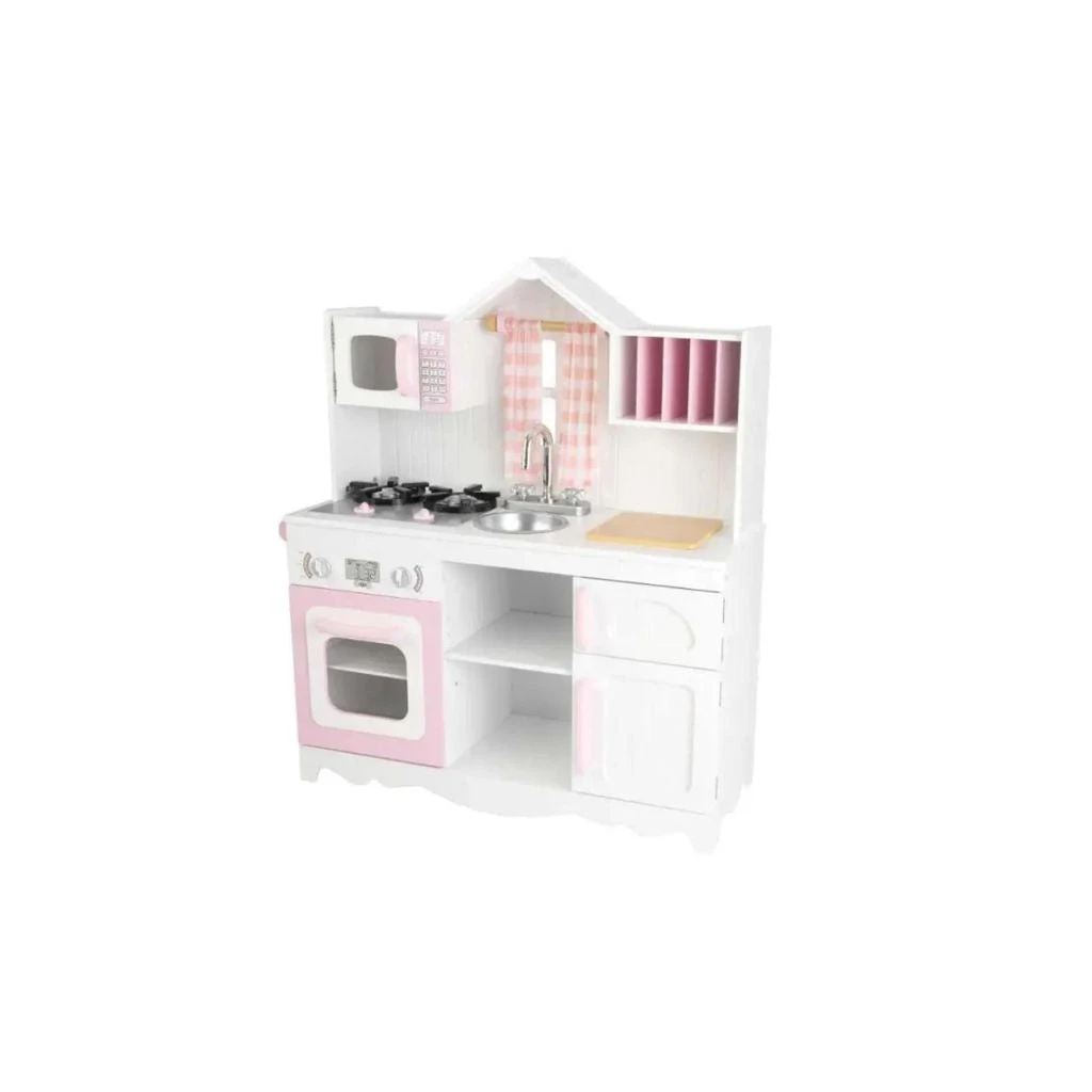 Young chefs are sure to love the KidKraft Modern Country Play Kitchen. It’s loaded with fun details to encourage and engage imaginations. Country-style paneled cabinetry, a fabric curtain over the window and a gable-peaked design all make this a lovely addition to playtime. Crafted from composite woods and high-quality molded plastic, this play kitchen will provide years of safe and sturdy fun.