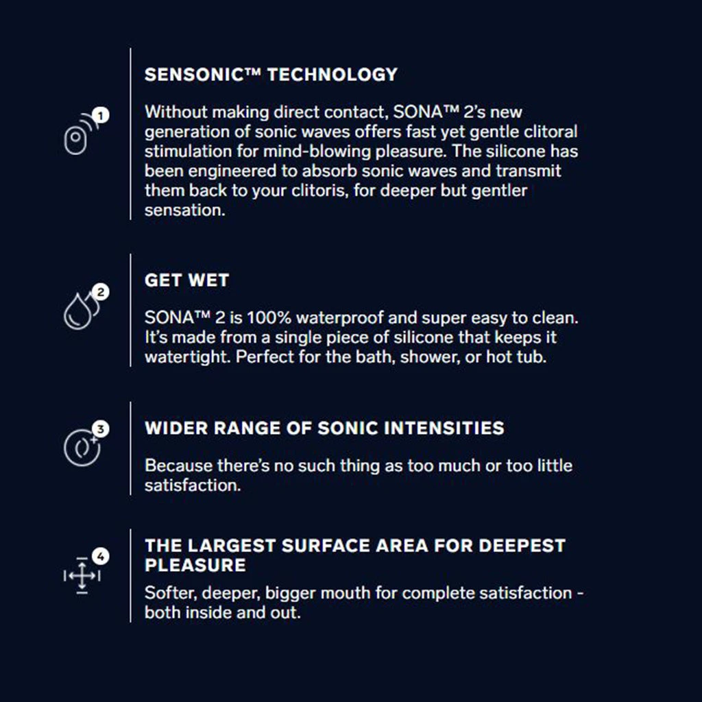 A whole new sensation for a whole new orgasm. If you ever felt like your climax could be bigger, bolder and more oooh-some – welcome! SONA™ 2 Cruise is the biggest step forward in pleasure in the past decade because it uses SenSonic technology to stimulate more of the clitoris than ever before.