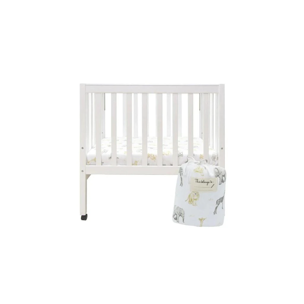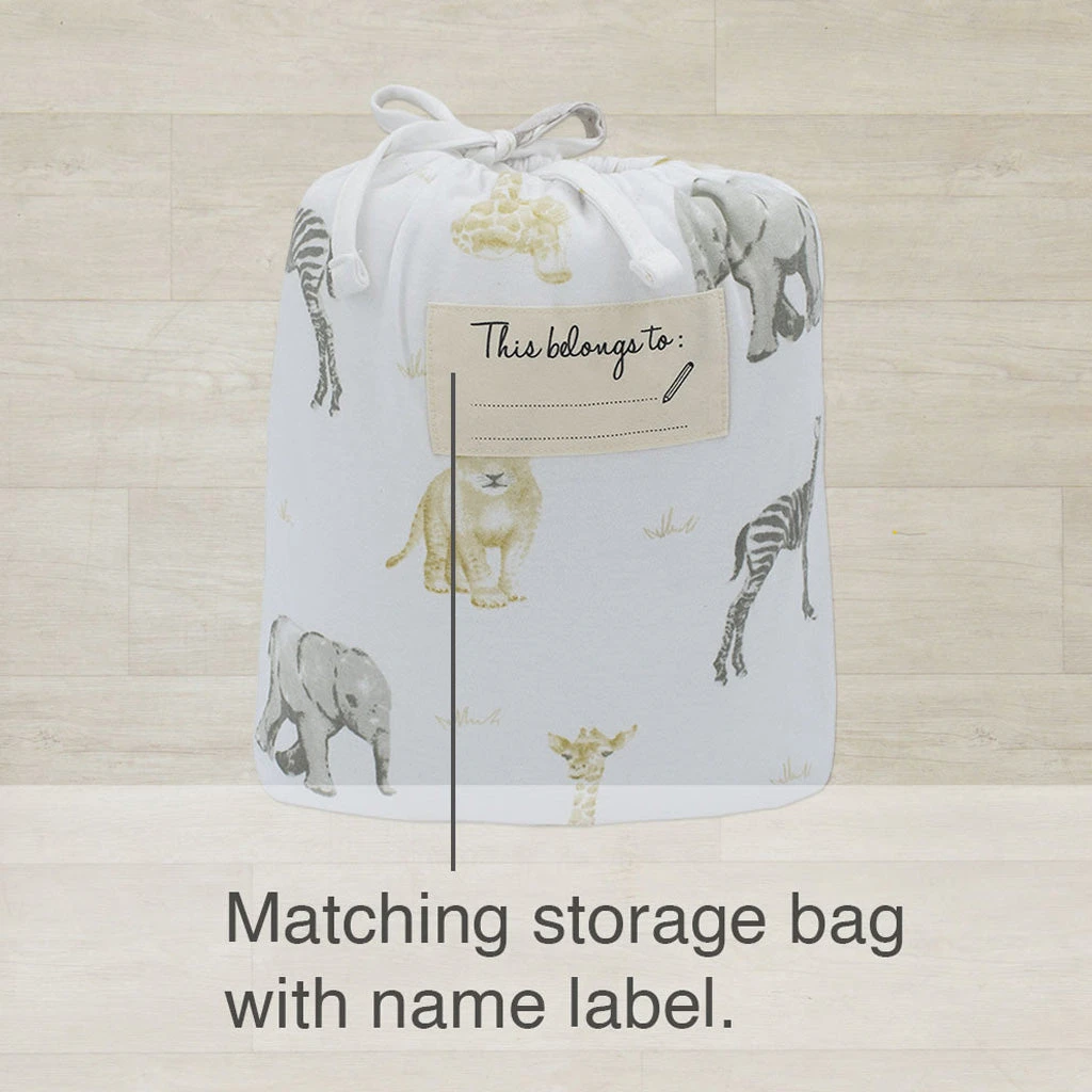 Perfectly sized to fit childcare cots, it folds up small and comes with a matching fabric storage bag with a customizable “I belong to” name label.