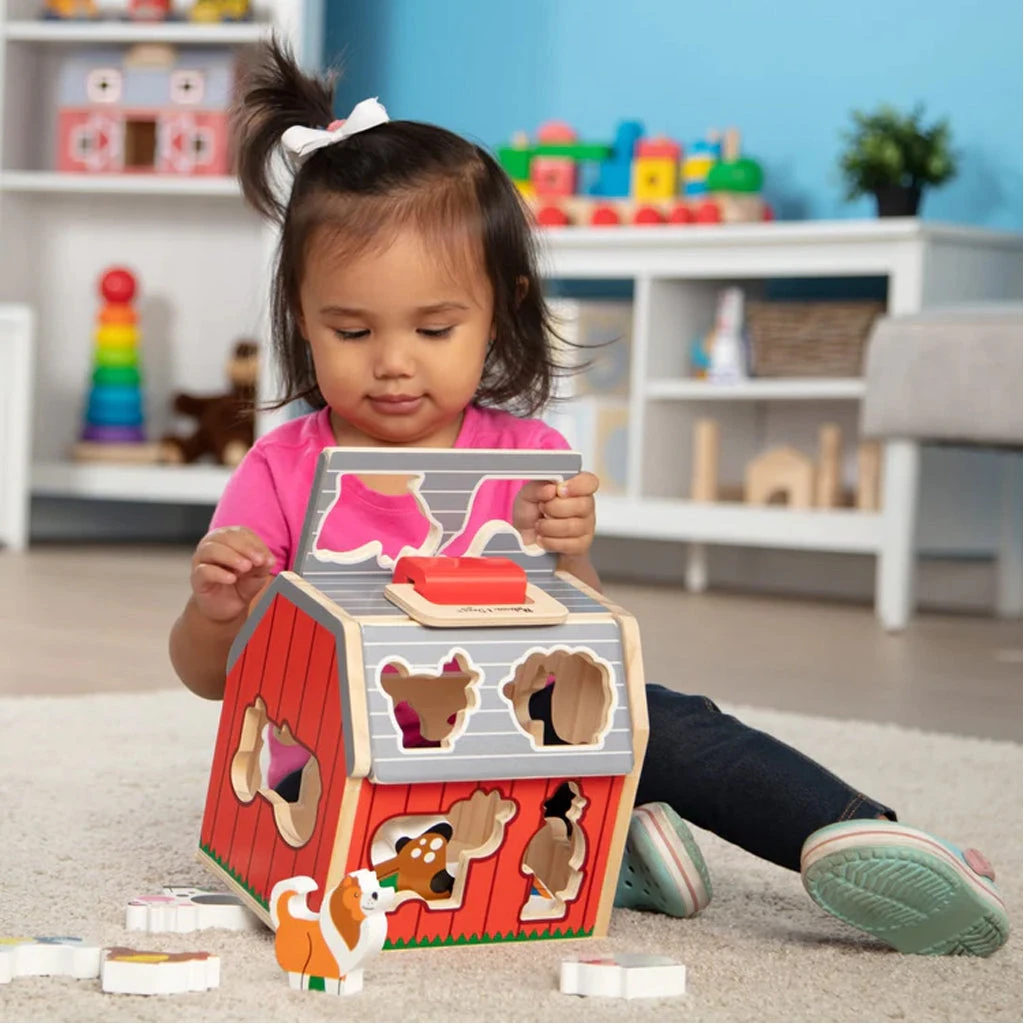 - Fit 10 wooden farm-themed play pieces into holes in the wooden sorting barn with handle for portability and flip-up roof for quick access