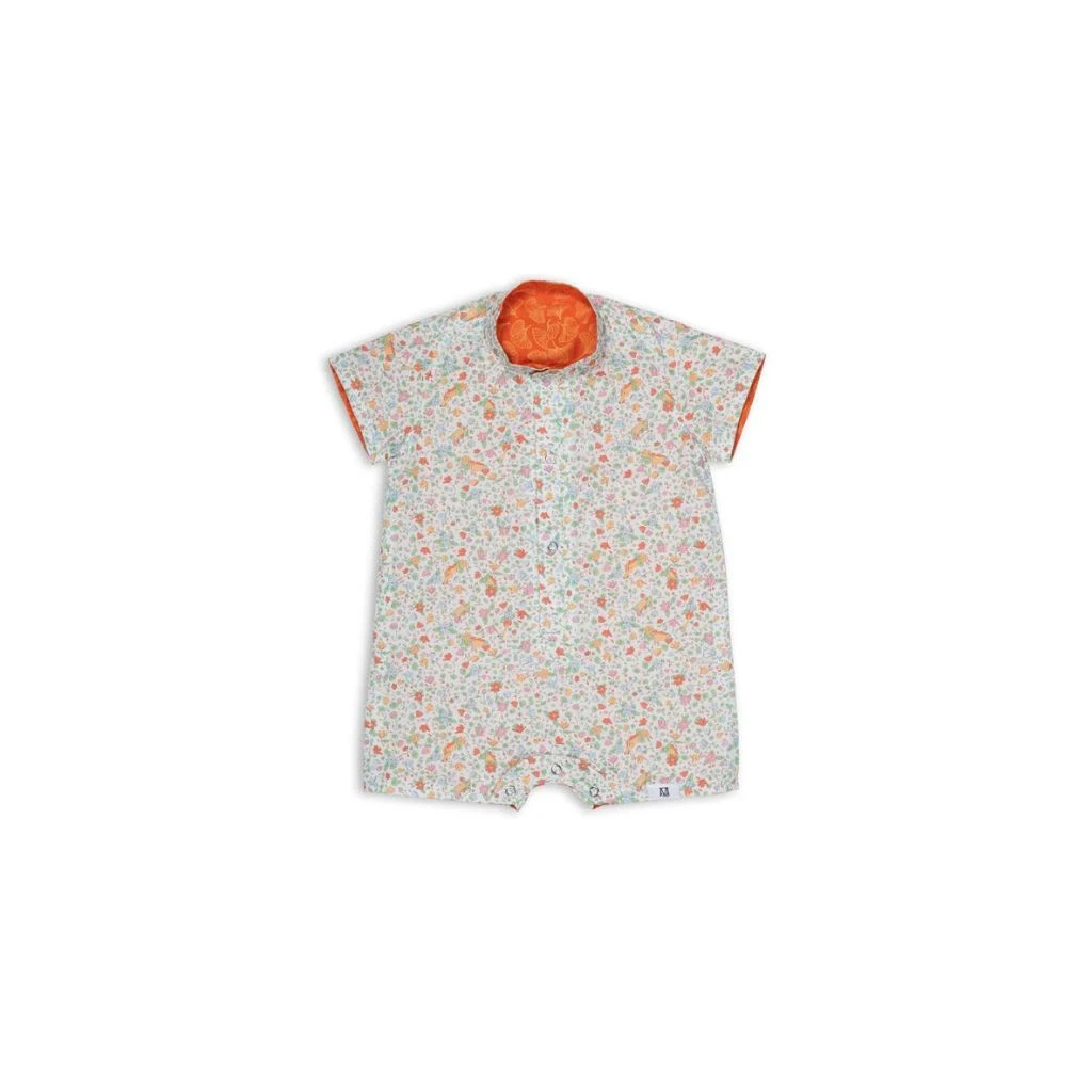 A baby boy onesie with a low Mandarin collar and short sleeves. Created in the style of a romper with ‘pants’.