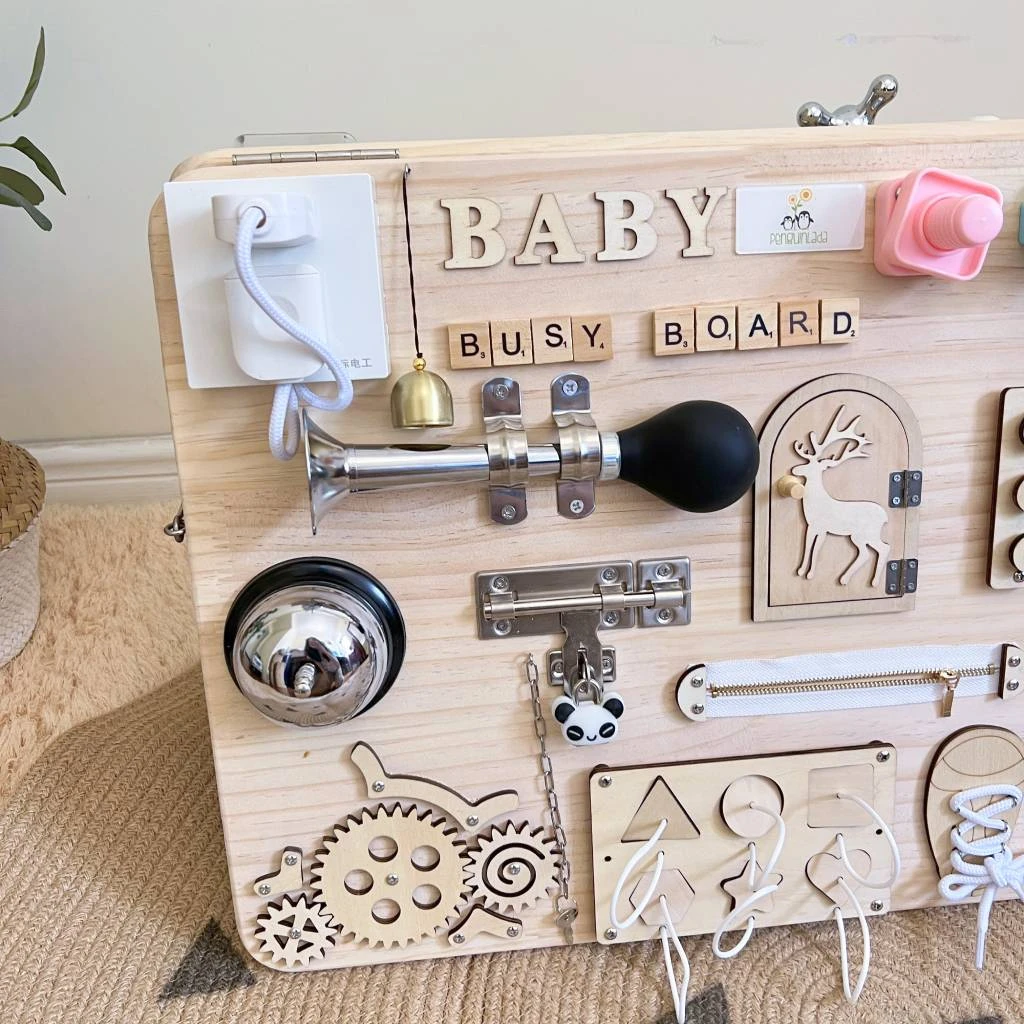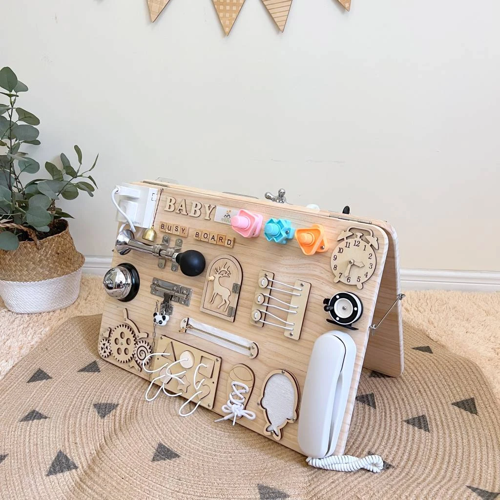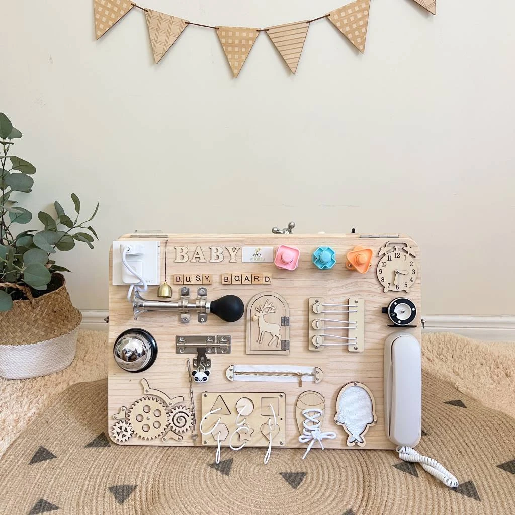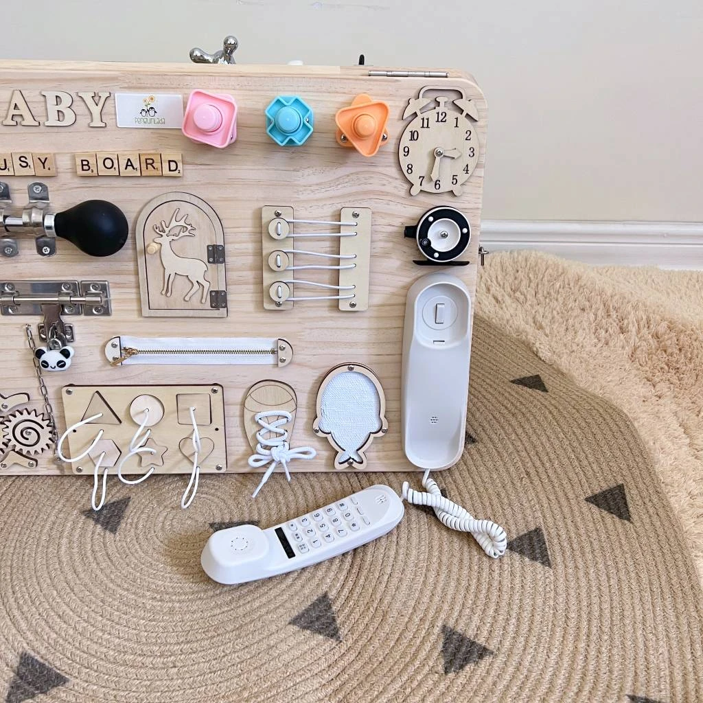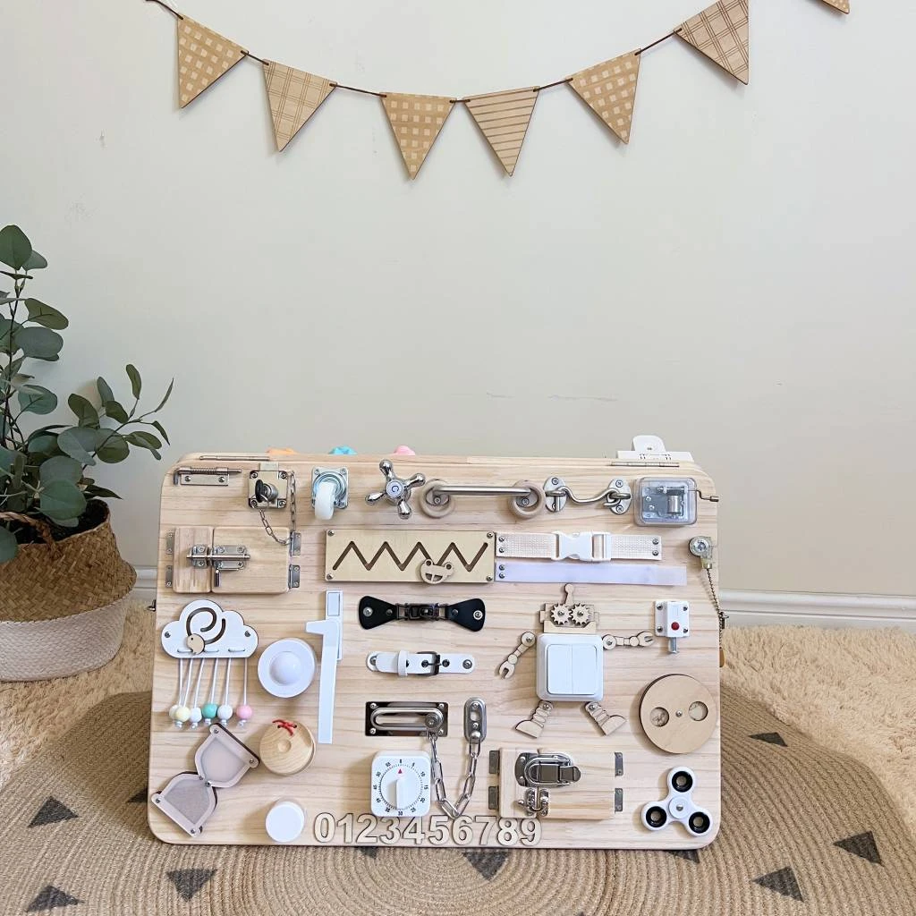 Our Busyboard is the perfect toy to impart essential skills through Montessori Method. Through playing, the little one get exposed to: