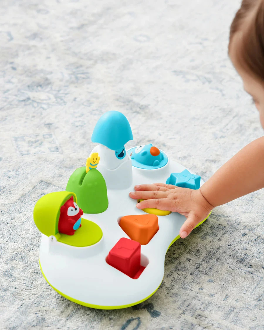 A playful intro to cause & effect, our colorful pop-up toy for baby is full of fun surprises, sounds and more for little hands to explore! Encourage fine motor skills and hand-eye coordination as baby presses, slides, toggles and turns the buttons to discover four cute action-packed friends including a peek-a-boo fox and a spinning hedgehog.