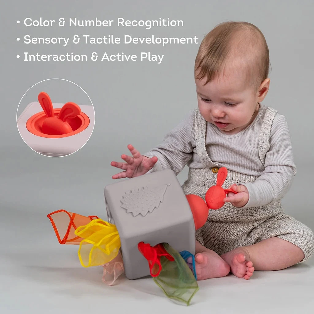 - Interactive Learning – The Baby Silicon Tissue Box Toy is designed with six sides of pure excitement, babies will discover a playful peek-a-boo bunny head to pull out and press in, an hedgehog sensory touch side, and a 3D flower for tactile fun. Plus, there’s a special opening designed for tiny hands to grab the tissues! Stimulate baby’s sensory learning and fine motor skills. Comes with 9 organza fabrics and an illustrated fabric, promoting fine motor skills, sensory development.
