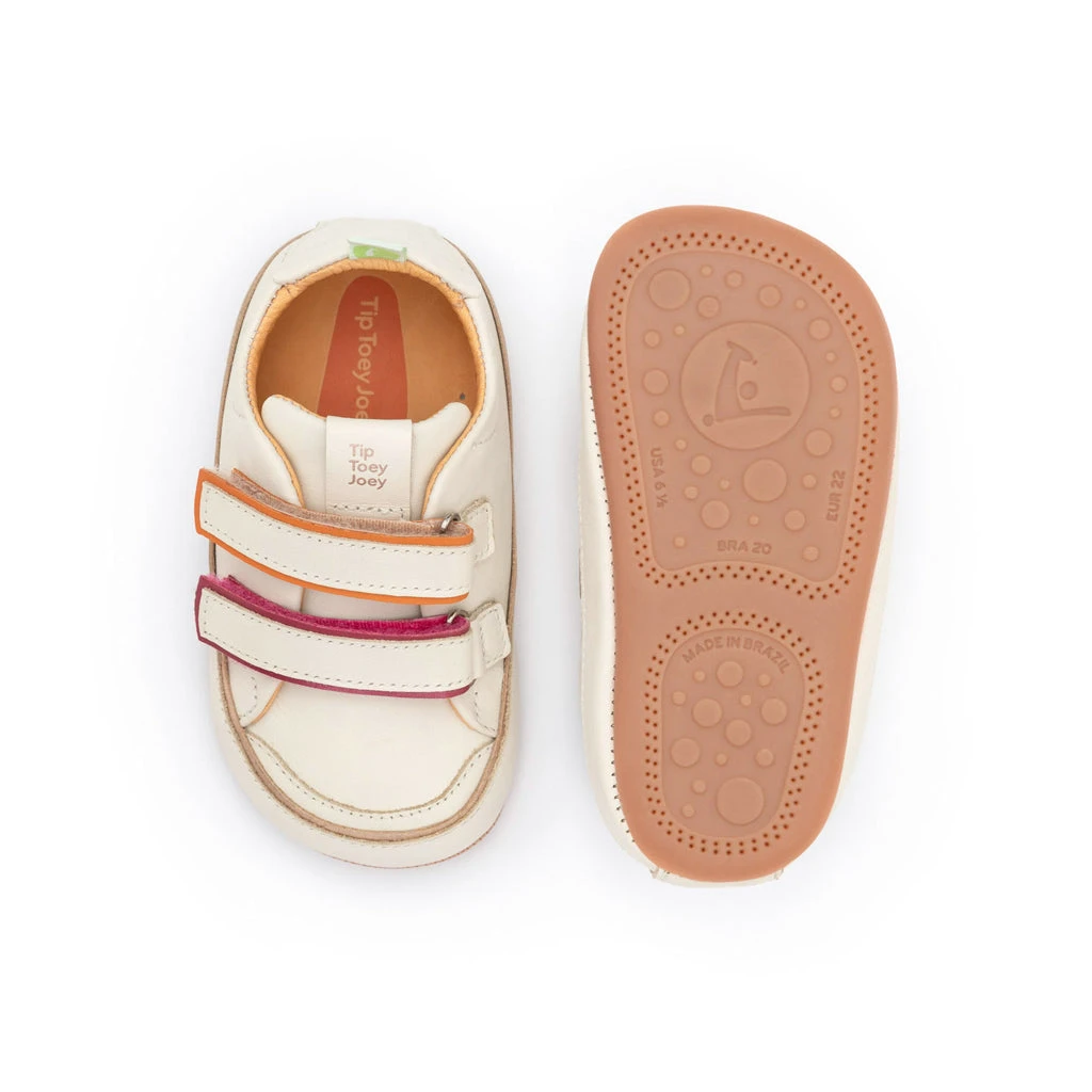 • Sizing of other brands are not a parameter for choosing your Tip Toey Joey. • Our unique FreeToGrow™ design is wider and foot-shaped, so the toes will be straight and activated to move and grow as free as if they were barefoot. For that reason, there is no need to buy bigger sizes. • Use our Size Guide to help you find the perfect size. • Our original Stretch&Stay™ elastic heel gently holds the shoe in place so first walkers are safe and free to move and explore their first steps. • This style has double velcro to make it easy on and off and provide a better fit. • Our in-built smart features promote the natural development of the foot and make our shoes fit perfectly, so you feel as comfy as if you were barefoot. • Extra soft leather produced within REACH international safety criteria. • Safe and non-toxic for babies and kids. • Soft breathable cotton so little feet won’t sweat. • Biodegradable and antibacterial leather-lined insole. • Butter-soft and flexible natural rubber sole.