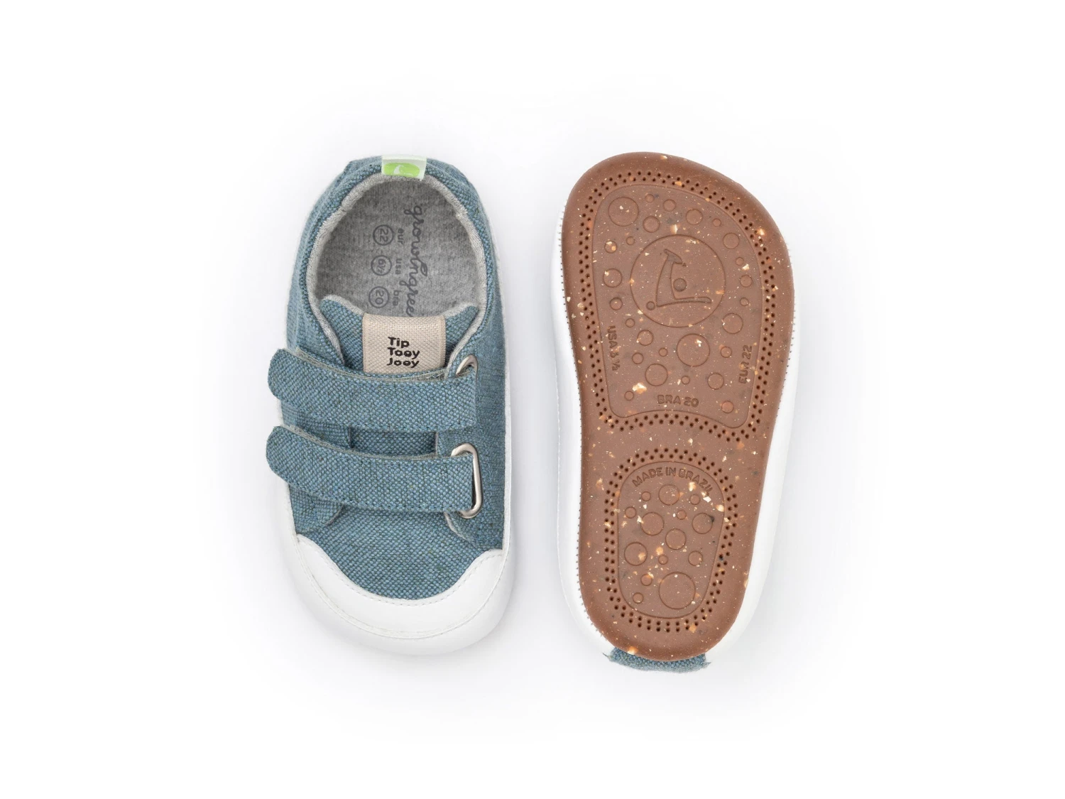 • Sizing of other brands are not a parameter for choosing your Tip Toey Joey. • Our unique FreeToGrow™ design is wider and foot-shaped, so the toes will be straight and activated to move and grow as free as if they were barefoot. For that reason, there is no need to buy bigger sizes. • Use our Size Guide to help you find the perfect size. • Our original Stretch&Stay™ elastic heel gently holds the shoe in place so first walkers are safe and free to move and explore their first steps. • This style has double velcro to make it easy on and off and provide a better fit. • Our in-built smart features promote the natural development of the foot and make our shoes fit perfectly, so you feel as comfy as if you were barefoot. • Leather-free composition. • Made from recycled eco-friendly canvas. • Extra soft cotton knit lining. • EVA insole lined with super soft cotton. • Natural rubber + recycled rubber sole.
