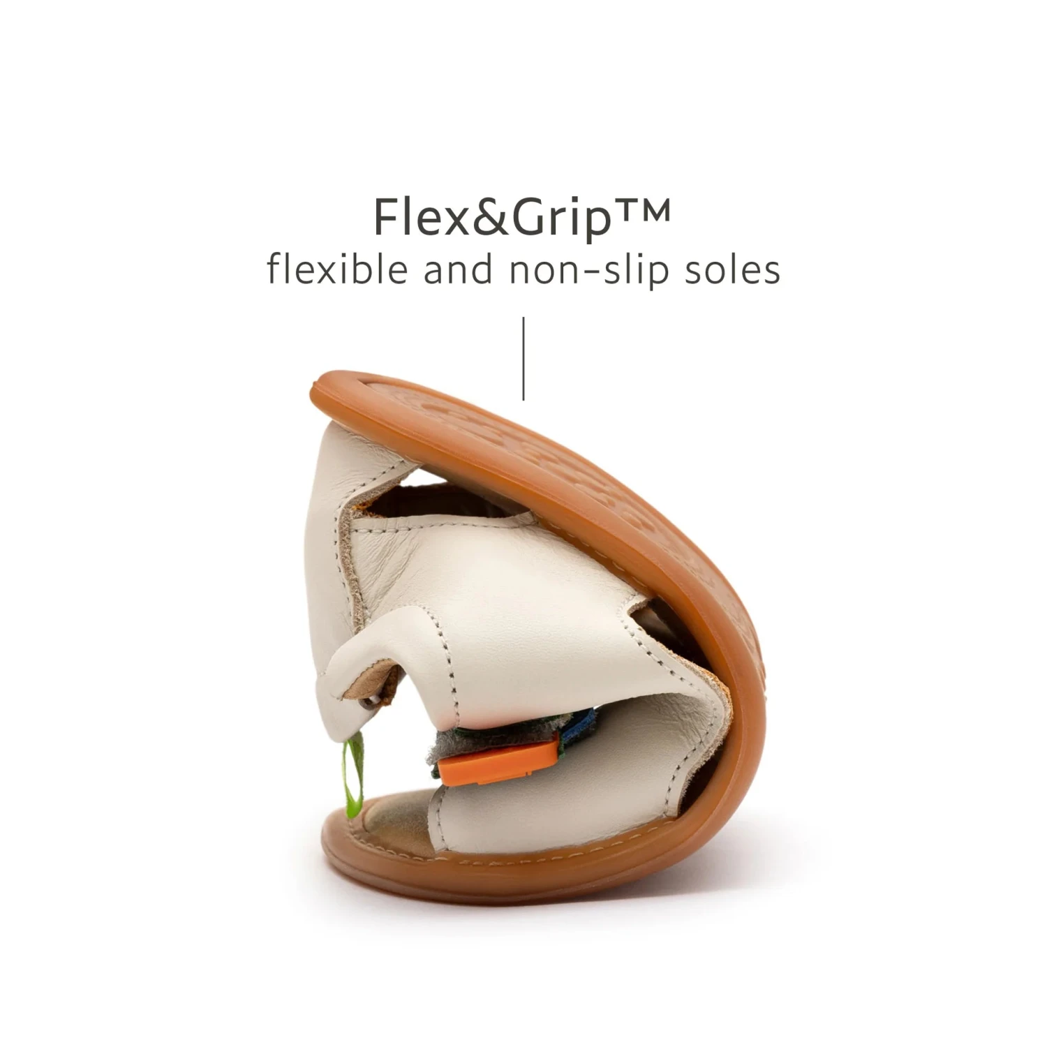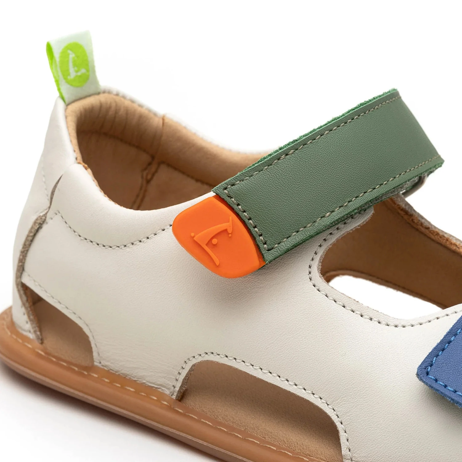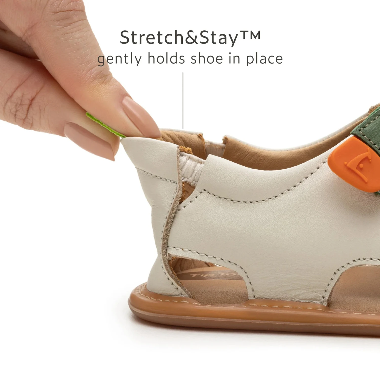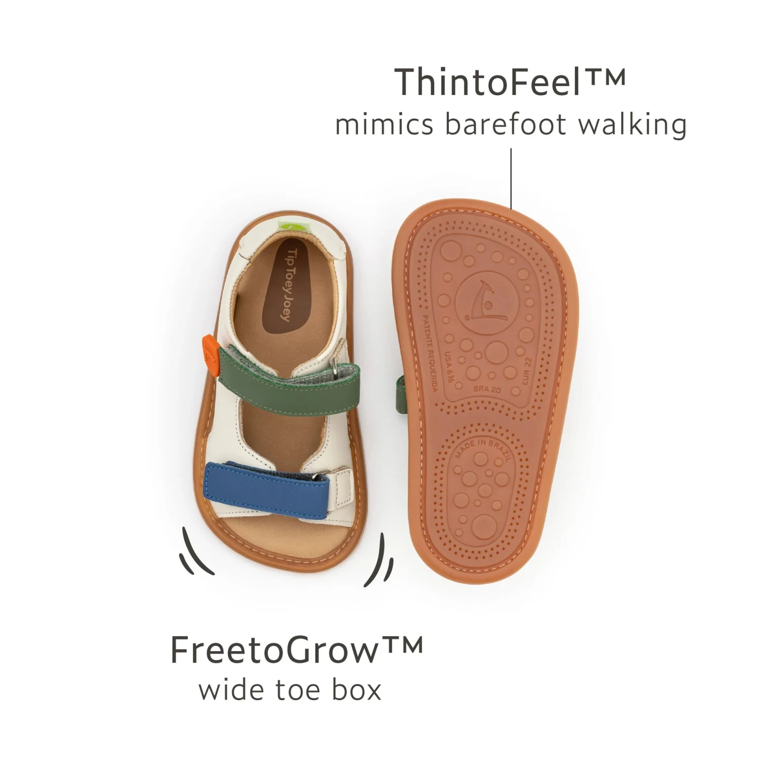 With double velcro fasteners, Explore Sandals in Tapioca / Blue Tang / Salsa by Tip Toey Joey are easy-on! It also features TTJ’s original elastic heel to help you put them on and not let the shoes fall off the feet.