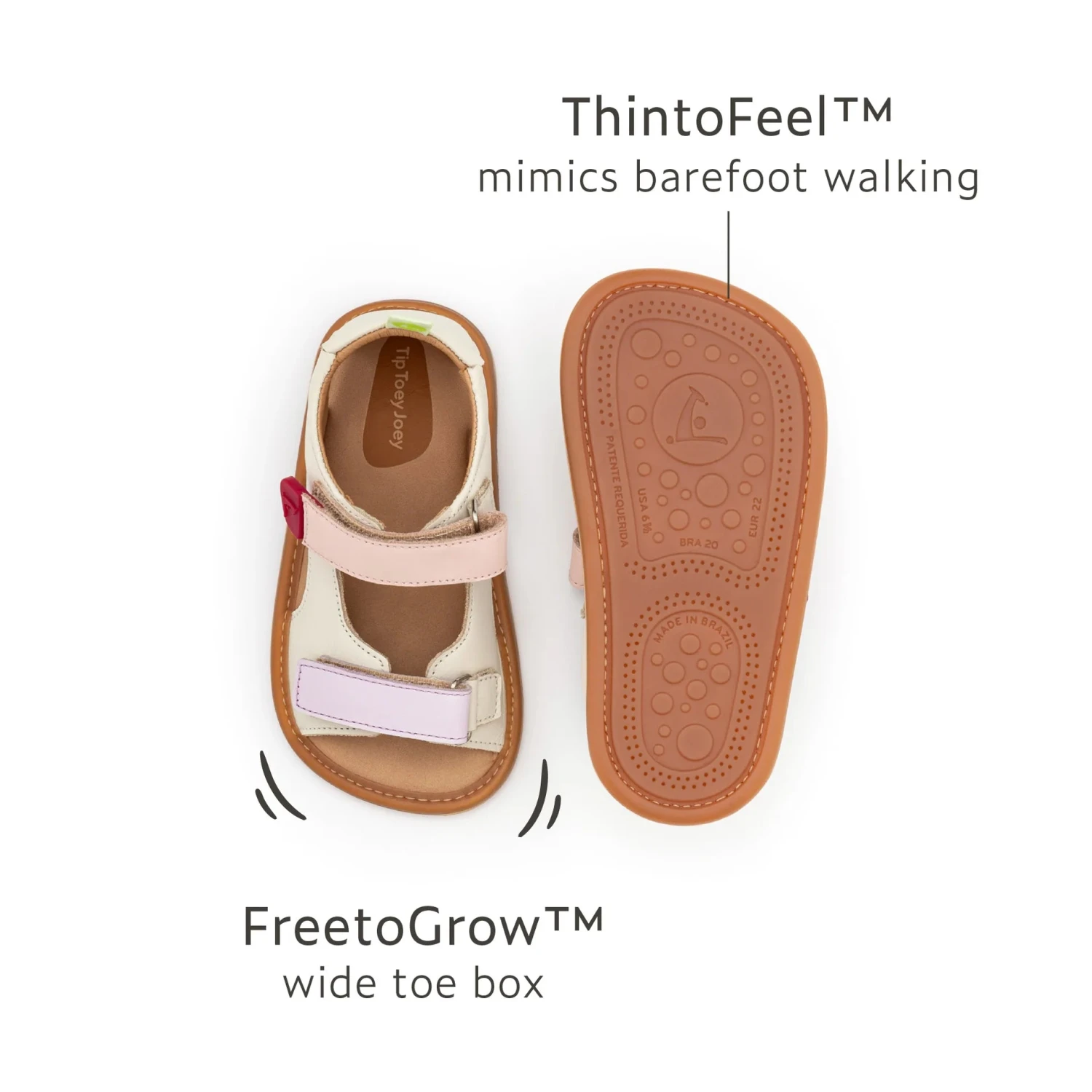 - Barefoot concept, ThintoFeel™ minimalist soles, with no heels, to promote sensory inputs from the lumps and bumps of the ground