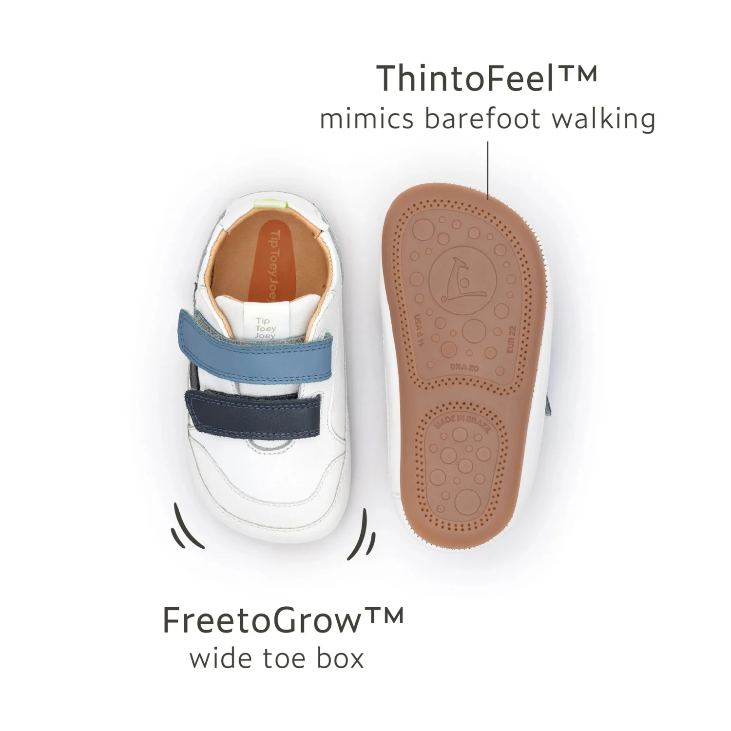 - Barefoot concept, ThintoFeel™ minimalist soles, with no heels, to promote sensory inputs from the lumps and bumps of the ground